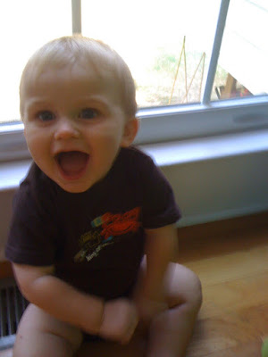 He is getting good at smiling now. He even responds to you with a smile sometimes. His favorite place to smile is on the changing table. Second favorite is on his play mats.